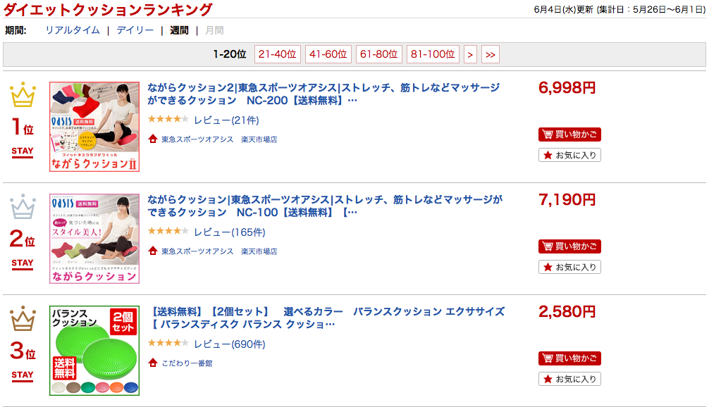 楽天市場のダイエットクッション部門・週間ランキング